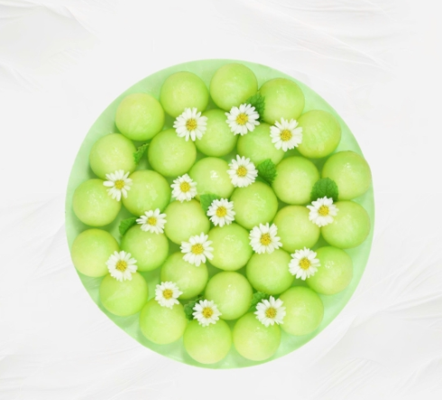 Bánh mousse dưa lưới tại Tiệm Bánh Kim Loan thu hút từ ánh nhìn đầu tiên nhờ sự trang trí tinh tế với những muỗng dưa lưới tròn, đều đặn và tươi ngon, mang sắc xanh tinh khiết. Bề mặt bánh được phủ kín bởi những viên dưa lưới tròn, tạo nên cảm giác tươi mát và sang trọng. Chính điều này đã làm bánh mousse dưa lưới trở thành lựa chọn lý tưởng cho những bữa tiệc đẳng cấp, từ tiệc gia đình đến sự kiện quan trọng.